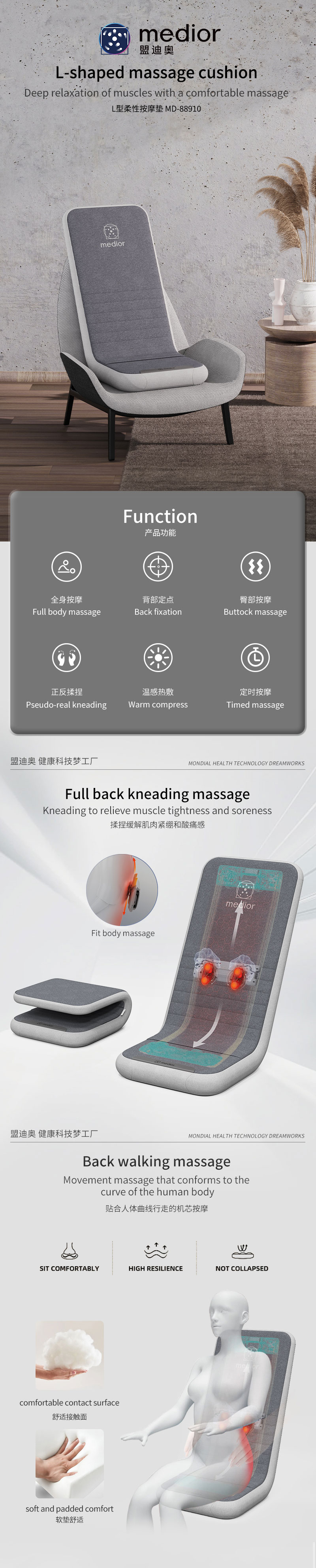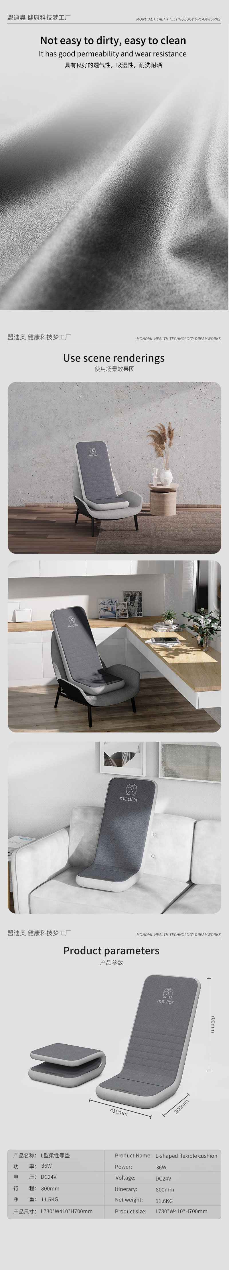 1、L型機(jī)芯結(jié)構(gòu),對折包裝縮小體積2、獨家專利柔性機(jī)芯3、力度三檔調(diào)節(jié),定點按摩,腰背按摩、臀腿按摩、全背按摩模式選擇4、背部行走揉捏,按摩區(qū)域加長到從肩膀到大腿;5、更加貼合不同款式的椅子整體可對折收納6、亞馬遜標(biāo)準(zhǔn)包裝尺寸