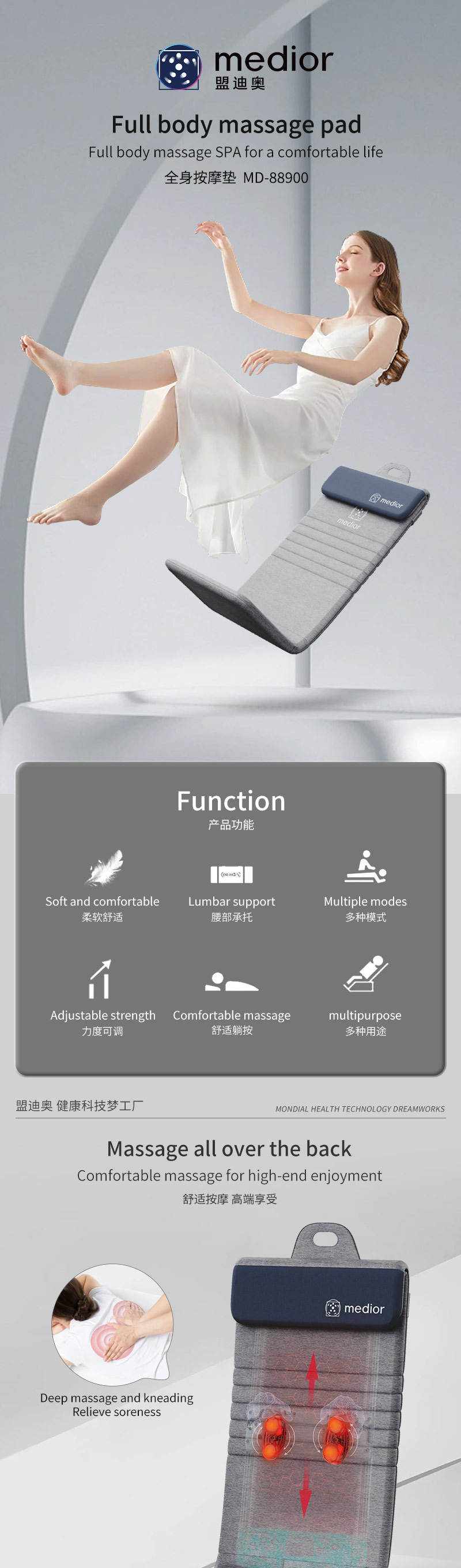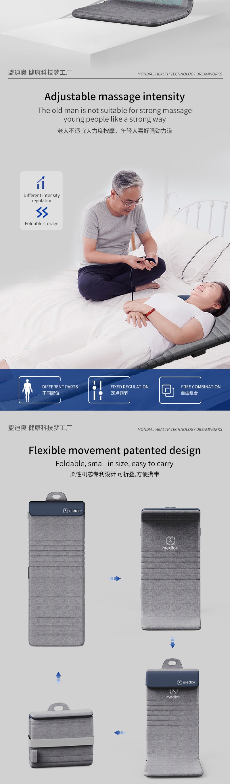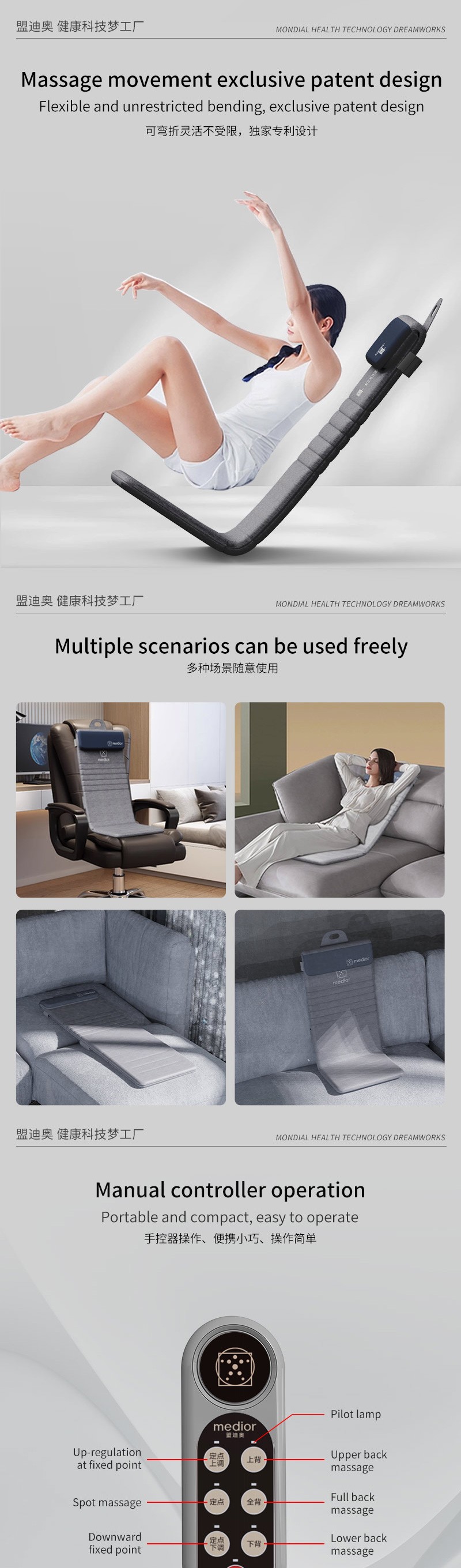 1、L型機芯結(jié)構(gòu),對折包裝縮小體積2、獨家專利柔性機芯3、力度三檔調(diào)節(jié),定點按摩,腰背按摩、臀腿按摩、全背按摩模式選擇4、背部行走揉捏,按摩區(qū)域加長到從肩膀到大腿;5、更加貼合不同款式的椅子整體可對折收納
