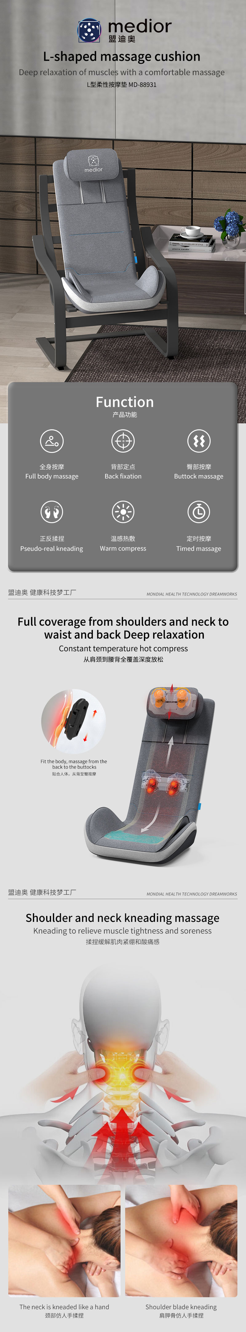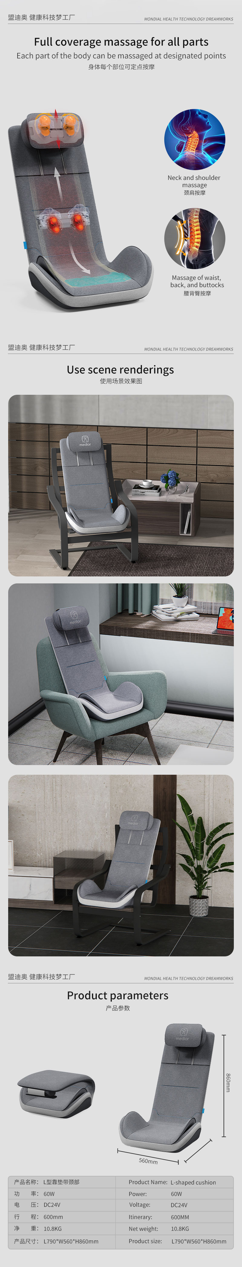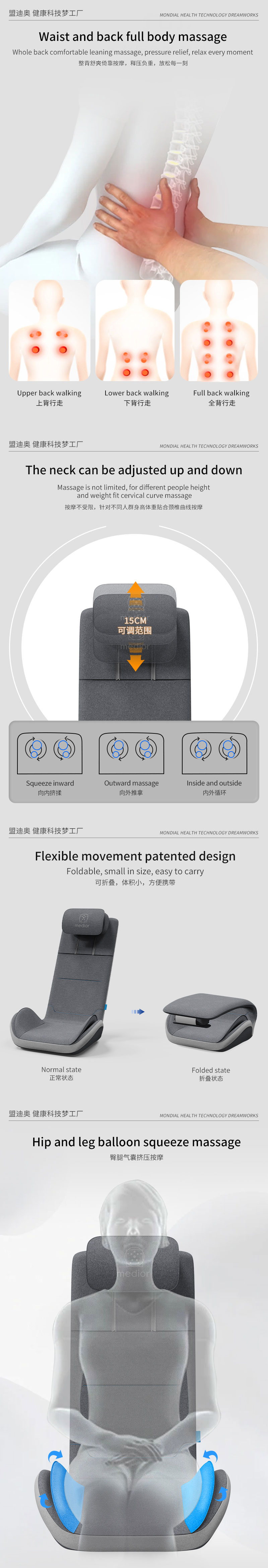 1、L型機芯結(jié)構,對折包裝縮小體積2、獨家專利柔性機芯3、力度三檔調(diào)節(jié),定點按摩,腰背按摩、臀腿按摩、全背按摩模式選擇4、背部行走揉捏,按摩區(qū)域加長到從肩膀到大腿;5、更加貼合不同款式的椅子整體可對折收納