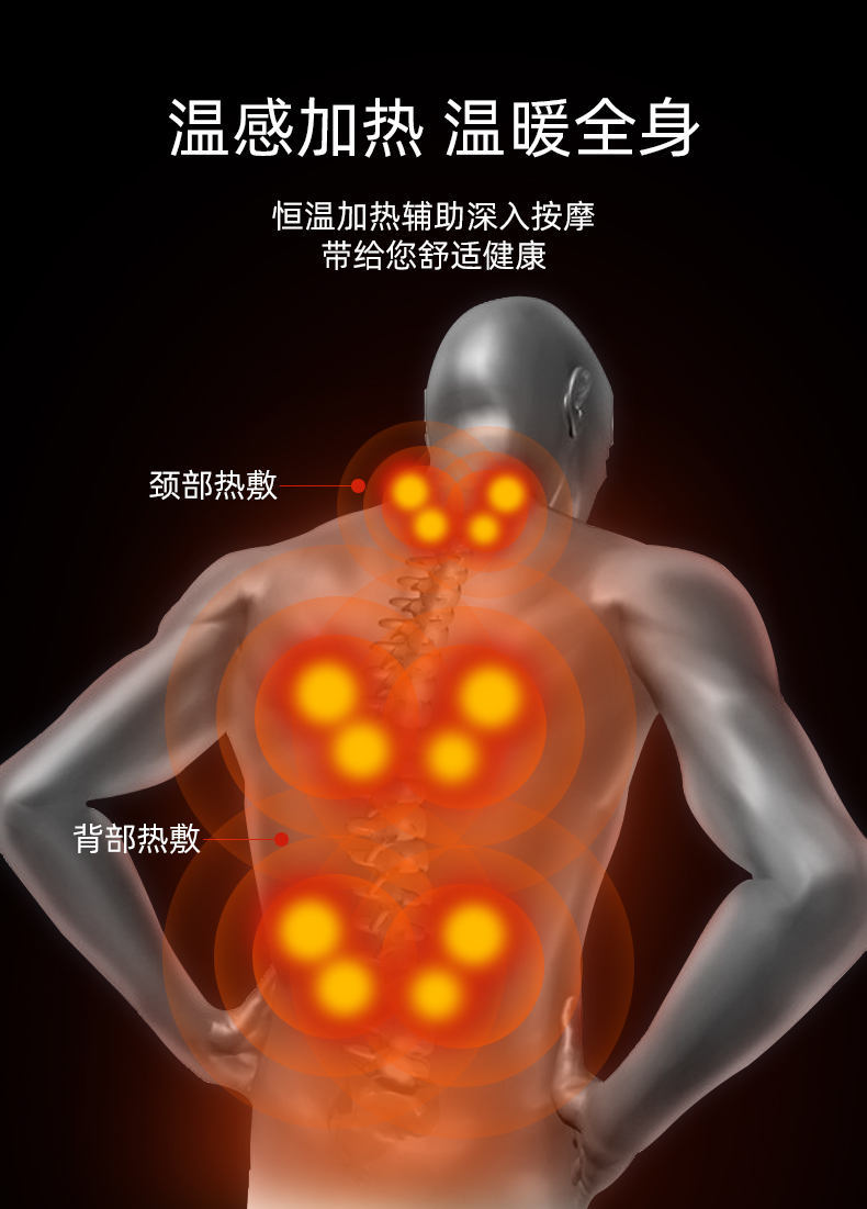 2.背部:上來來回按摩,有2組共4個揉捏按摩頭,有2組4個揉捏敲擊按摩頭。