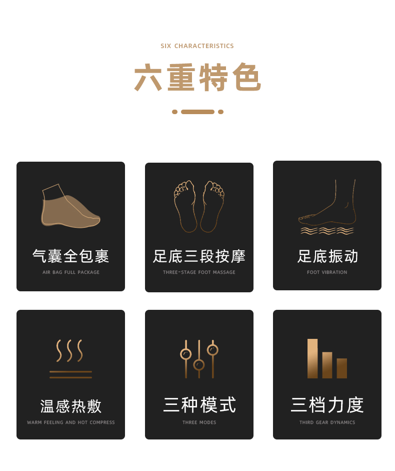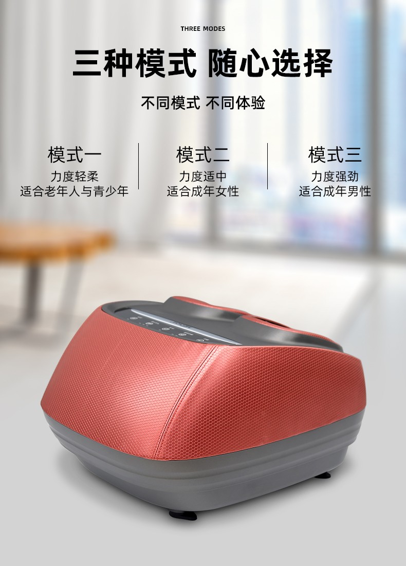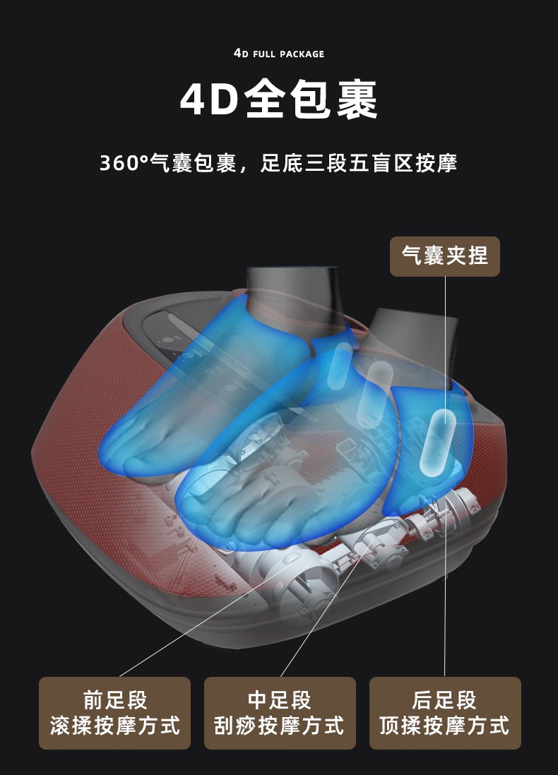 滾輪按壓(腳趾)、刮痧(腳弓)、捶打(腳后跟)按摩 (多模式,多強度);